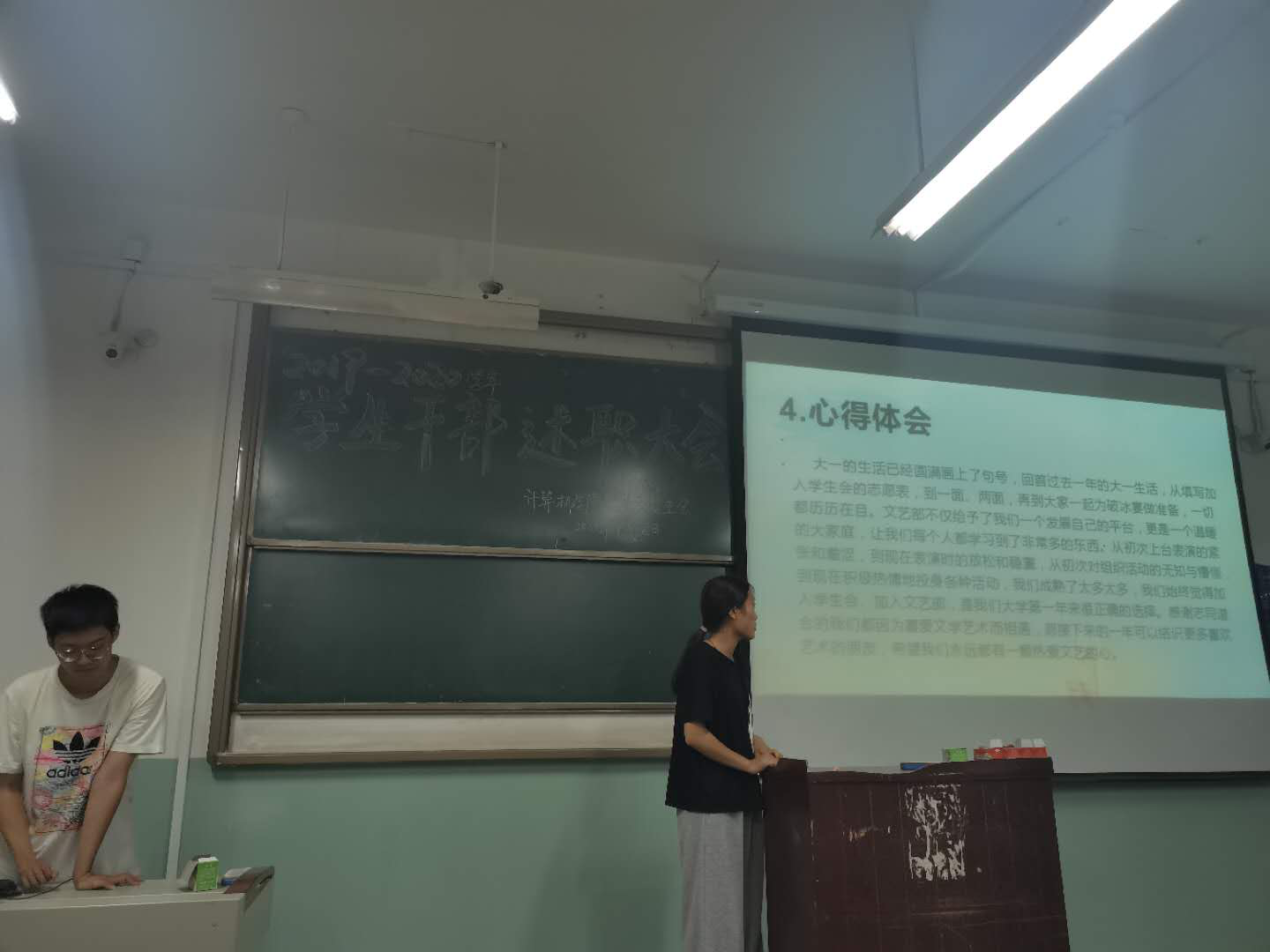 会上,大三员工干部通过PPT对各自部门工作职能、工作内容、工作体会和改进措施进行展示和讲解,讲述一年中自己的成长以及在部门中的收获。大二成员就新学期工作规划进行汇报,表达了在新学期开始,创新活动形式,更好地服务师生,履行职责,营造青春向上的团学风貌。
