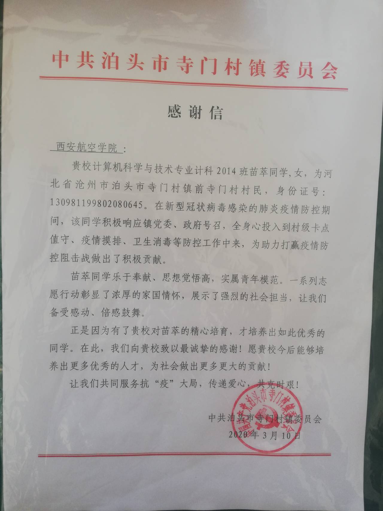 近日,必一运动收到一封来自河北省泊头市的感谢信,信中对公司计算机科学与技术2014班员工苗萃在疫情期间乐于奉献的精神和作为志愿者的优异表现进行肯定和赞扬,并对公司培养出如此勇于担当的学子表示感谢。