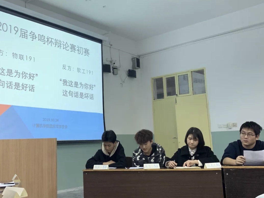 初赛中大一八个班分为四个赛场。在正反双方简洁的自我介绍后,比赛正式开始。双方就“‘我这是为你好’这句话是好话还是坏话”的问题展开辩论。双方选手在立论、驳立论、智辩等各个环节中思路清晰,引经据典,字字珠玑,使现场气氛迅速升温。在随后的自由辩论环节中,双方选手就辩题展开更深层次的辩论,将比赛推向高潮。各个辩手清晰的思路和巧妙的陈词给观众留下了深刻印象。评委对本次辩论赛做了精彩的点评,他们指出了双方的优点和不足,并表示期待大家的进步。最后,计科191、计科193、软件191、软件193以优秀的表现获得了最终的胜利。