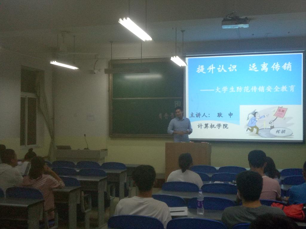 耿老师指出了传销的特点,揭露了传销发展下级、虚拟产品、复式计酬等行骗方式,强调传销是法律明确限定的违法行为,对个人和社会都有巨大危害。同学们在了解一些常见骗术案例之后,纷纷表示会提高警惕性,不盲目相信不实招聘信息、虚假消息。