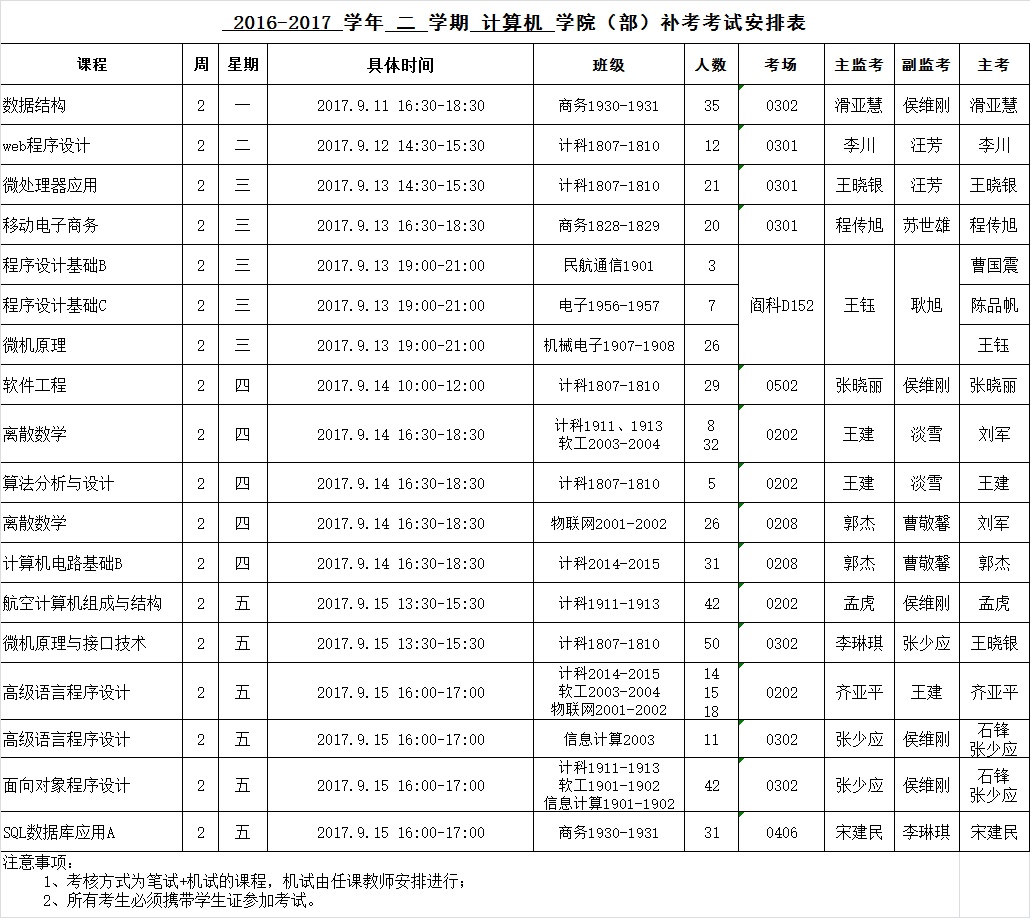 必一运动2016-2017-2学期课程补考安排表