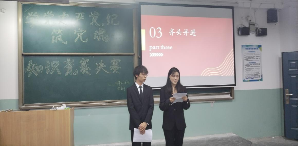 为深入贯彻落实党中央全面从严治党要求,提高支部组织的凝聚力、号召力和学习动力,增强支部青年同志们的责任感、使命感和光荣感,公司员工党务中心于6月5日晚在主楼320教室举办以“学党史、严党纪、筑党魂”为主题的知识竞赛决赛活动。本次活动由张露露和刘婧担任主持人,参赛队伍由初赛中表现出色的同学们随机组成,共四组。公司员工第一党支部书记贺宇、员工党务中心负责人高韶韶以及员工支部入党积极分子出席本次活动。